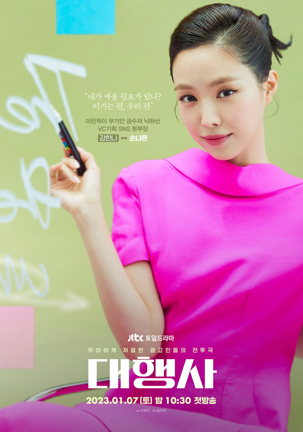 JTBC 새 토일드라마 '대행사'는 VC그룹 최초로 여성 임원이 된 '고아인'이 최초를 넘어 최고의 위치까지 자신의 커리어를 만들어가는 모습을 그린 우아하게 처절한 광고인들의 전투극. 인기리에 방영 중인 '재벌집 막내아들' 후속으로 오는 1월 7일 오후 10시 30분 첫 방송된다.