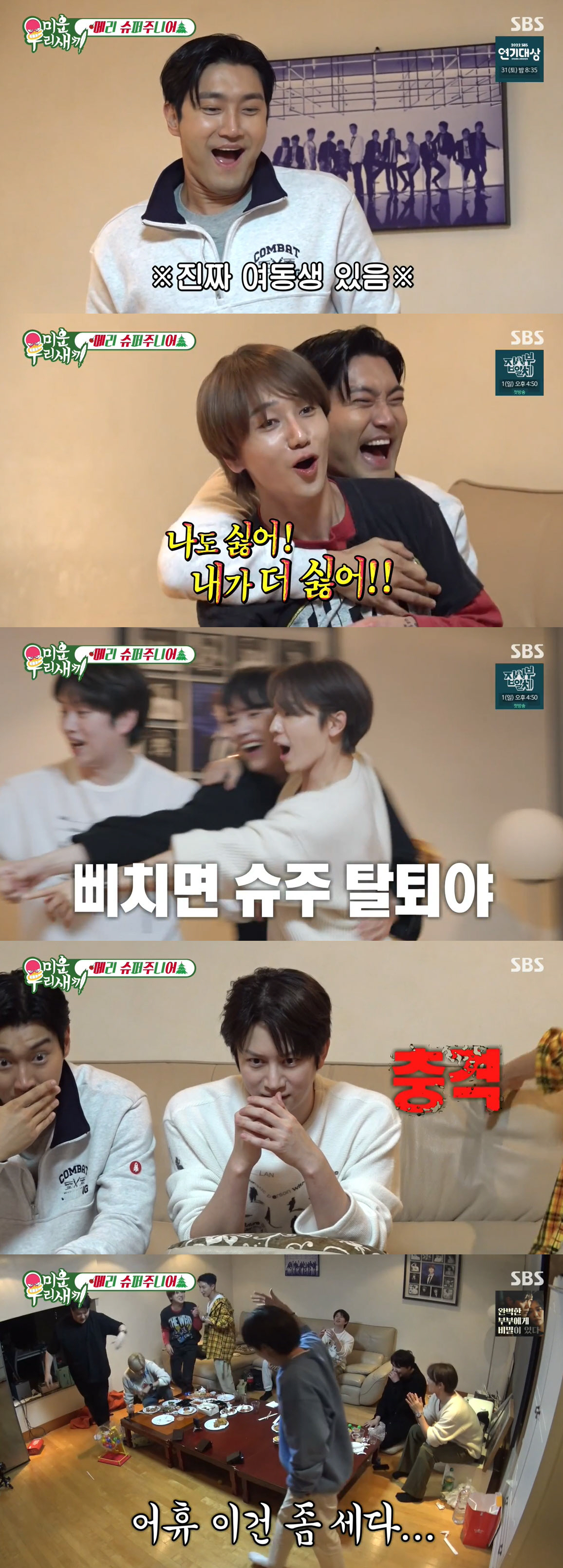 '생각보다 여자들이 싫어할 것 같은 멤버' 질문에는 김희철이 뽑혔다. 김희철은 자신이 지명 당하자 충격에 쓰러졌고 멤버들은 "더 이상 못하겠다"며 포기를 선언하고 뿔뿔이 흩어져 웃음을 자아냈다. tokkig@sportschosun.com