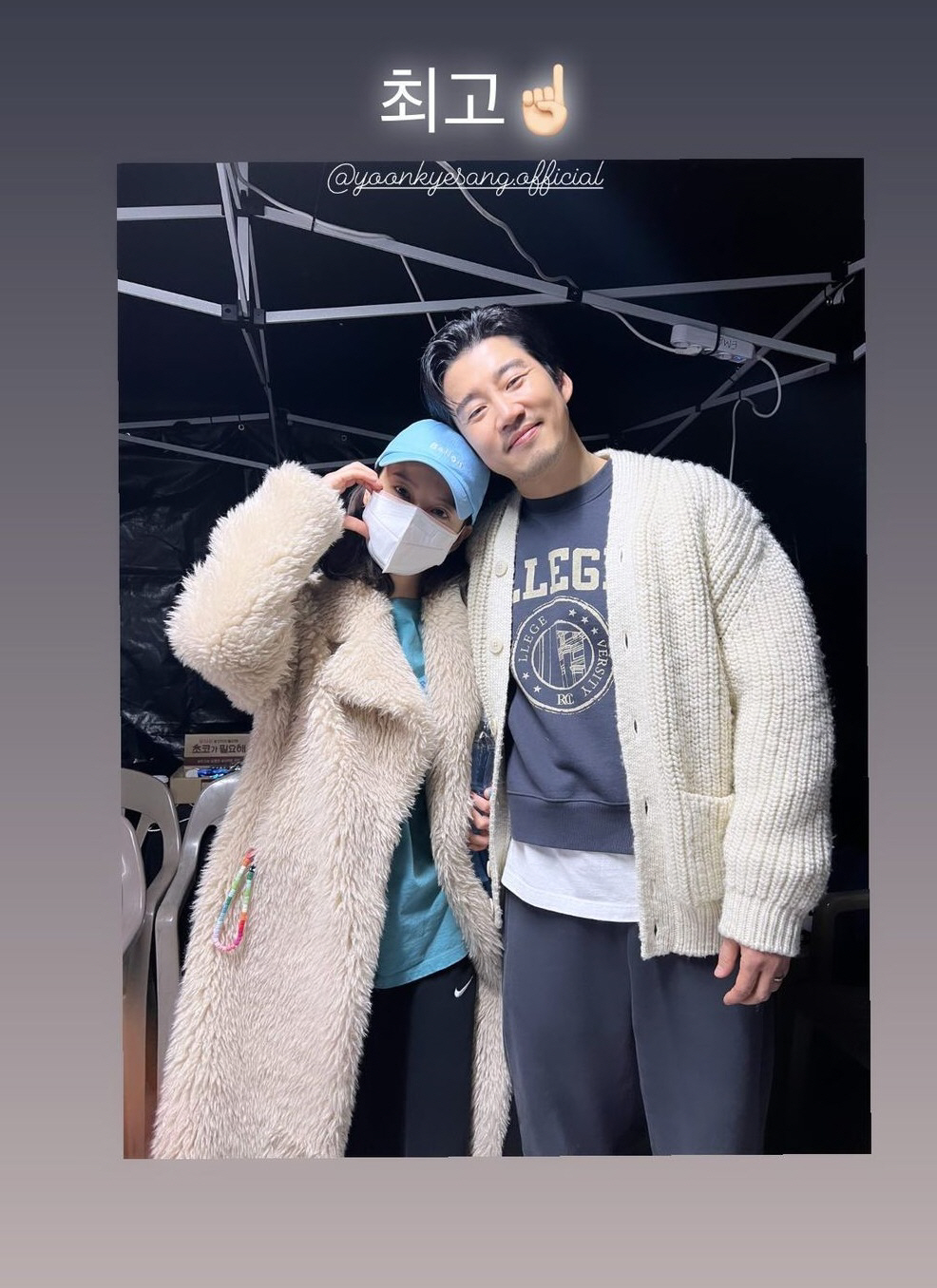 정유미는 26일 "최고"라는 글과 함께 여러 장의 사진을 게재했다. 공개된 사진 속에는 지난 24~25일 부산에서 열린 god 콘서트 'ON'을 간 정유미의 모습이 담겼다. god 응원봉도 들고 간 정유미는 윤계상과 만나 다정한 볼하트 포즈로 인증샷을 남겼다.