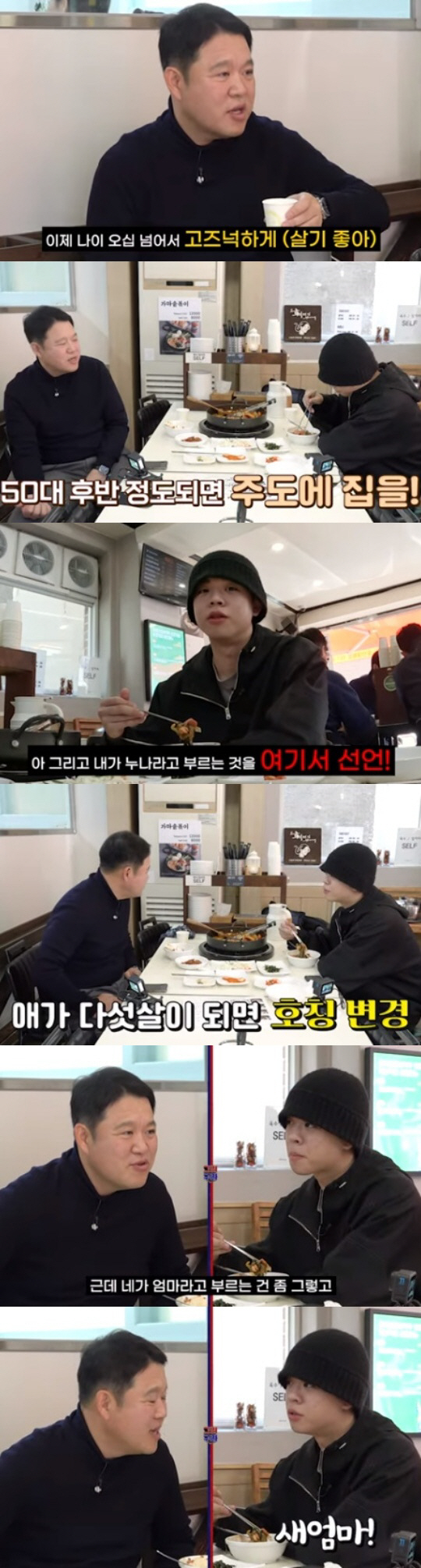 이를 들은 그리는 "갑자기요? 세컨하우스를 사는 건 어떠냐"고 말했고, 김구라는 "50대 후반 정도 되면 제주도에 집을 하나 해서 둘째하고 와이프는 제주도에 있고, 난 일 있을 때마다 왔다 갔다 하는 삶을 추구하려고 한다"고 전했다.