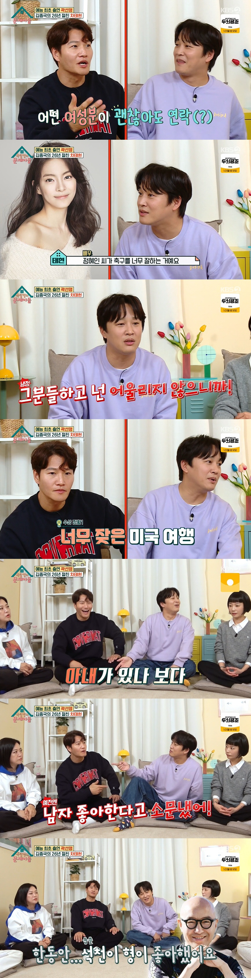 차태현은 "종국이가 축구를 잘하지 않냐. '골때녀'를 재밌게 보다가 정혜인 씨가 축구를 너무 잘하더라. 그래서 일면식도 없는 분인데 종국이한테 전화해서 '너의 이상형을 찾은 거 같다'고 했다"고 털어놔 웃음을 안겼다. 김종국은 "자기가 아는 사람도 아닌데 갑자기 전화해서 이런 적이 몇 번 있다"며 "정작 예전에 한창 활동하고 그럴 때는 이런 게 없었다"고 말했다. 그러자 차태현은 "그분들하고 넌 어울리지 않으니까"라며 단호한 모습을 보였고, 김종국은 "아무튼 뭐든지 자기 멋대로다"라며 티격태격했다.