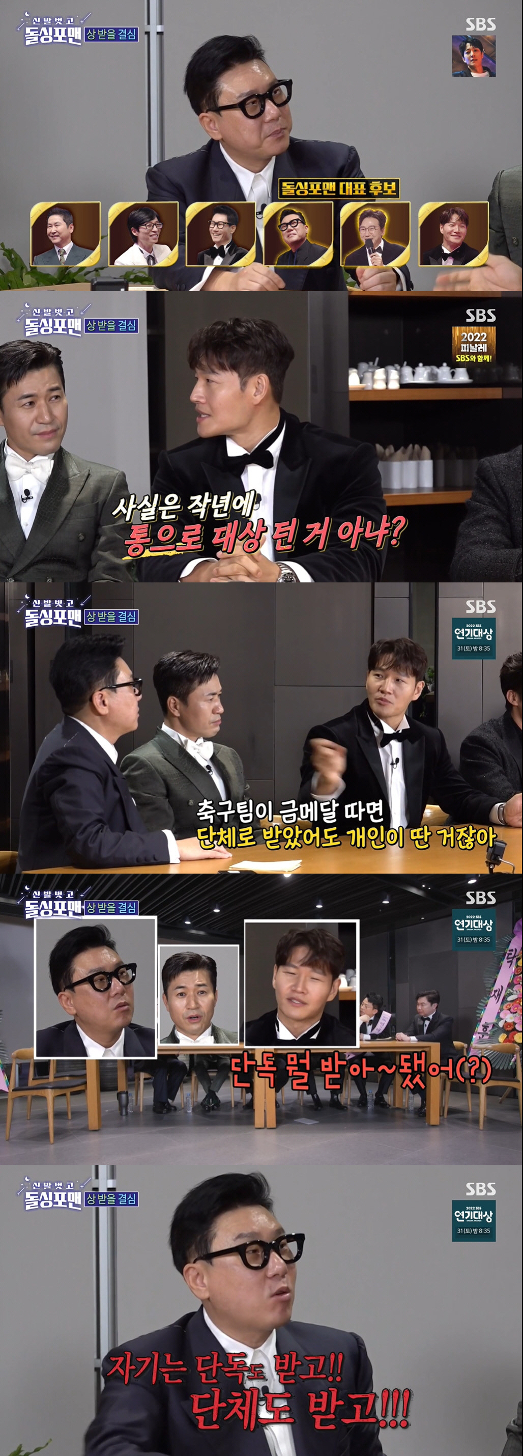 '연예대상' 2시간 전, '돌싱포맨' 멤버들과 김종국, 김종민, 허경환이 대기실에 모였다. 이상민은 "종국이도 대상 후보지만 '돌싱포맨'에도 2명의 대상 후보가 있다"라면서 자신과 탁재훈을 이야기했다. 이에 김종국은 "작년에 통으로 대상 받은 거 아니냐"면서 '2021 연예대상'에서 '미운 우리 새끼'팀이 대상을 받은 것을 언급했다. 김종국은 "축구팀이 금메달 따면 단체로 받았어도 개인이 금메달 딴 거 아니냐"면서 "형은 대상을 받았는데 왜 또 받으려 하냐"라고 해 이상민을 당황하게 만들었다. 이에 김종민은 "상민이 형 단독으로 안 받지 않았냐"고 했지만, 김종국은 "단독 뭘 받냐. 됐다"고 했다. 그러자 이상민은 "자기는 단독도 받고 단체도 받고"라며 분노했다.