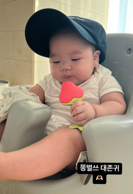 공개된 사진 속 제이쓴 홍현희의 아들은 범보의자에 앉아 치발기를 들고 있는 모습. 어른 모자를 쓰고 오동통한 볼살과 깜찍한 자태를 드러내 랜선 이모, 삼촌들의 미소를 자아낸다.