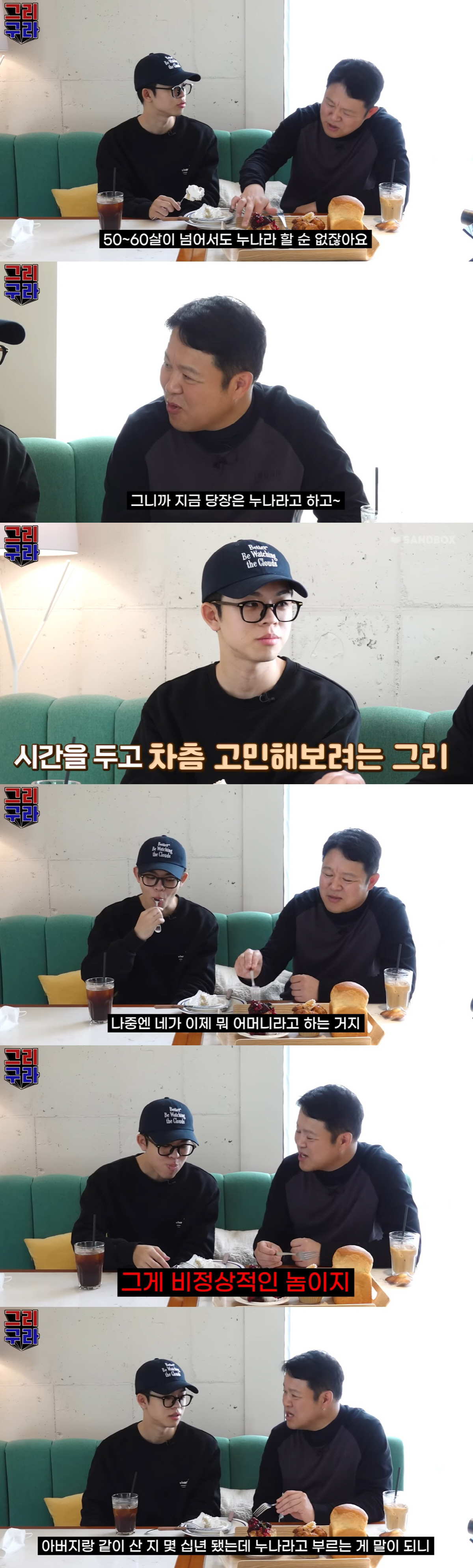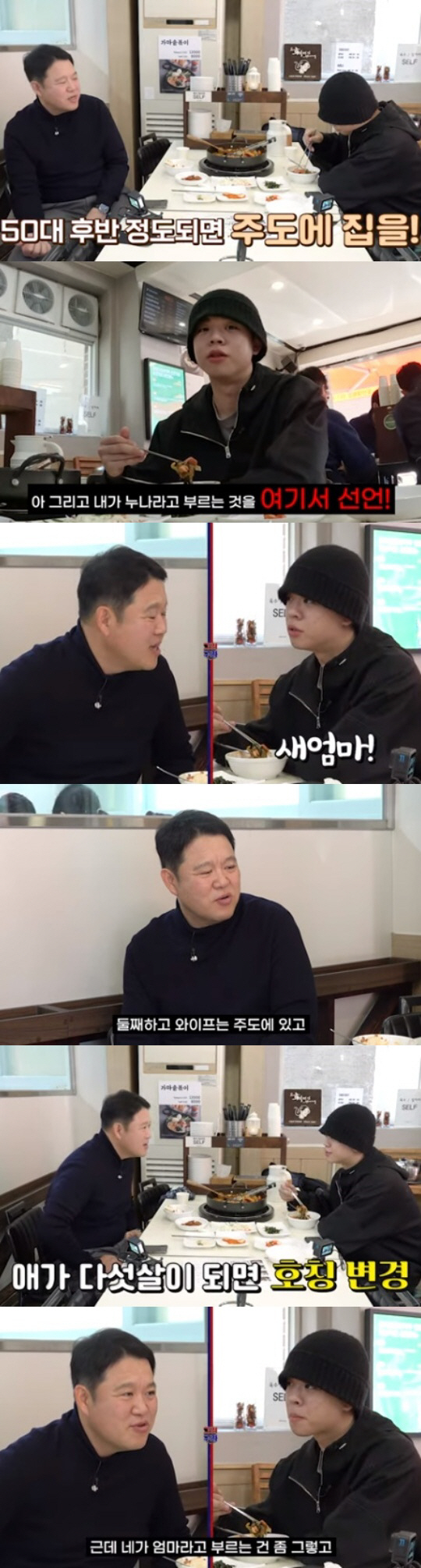 그리는 "멋있는 삶이다"라며 부러워했다. 그러더니 갑자기 "여기서 선언하겠다. 내가 (새어머니를) 누나라고 부르는 걸 애가 다섯 살이 되면 '엄마'라고 부르겠다"고 밝혔다. 그동안 새어머니를 '누나'라고 불렀던 그리가 늦둥이 동생이 5세가 되면 호칭을 변경하겠다고 선언한 것.