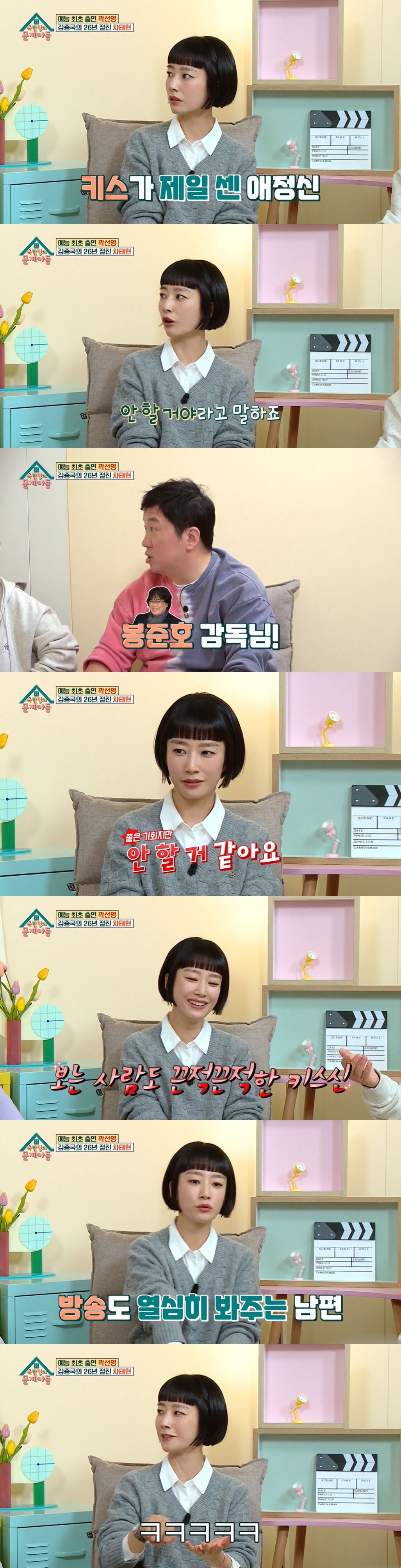그러자 정형돈은 "남편분이 혹시나..."라고 물었고, 곽선영은 "남편이 모니터를 열심히 해주는 편이다. 남편에게 촬영 끝나고 'ㅋㅋㅋㅋㅋㅋㅋ'라면서 카톡이 왔다"고 했다. 그러자 차태현은 "신경 쓰였네"라고 했고, 김종국은 "(ㅋㅋㅋ가)과하다"고 거들어 웃음을 안겼다.