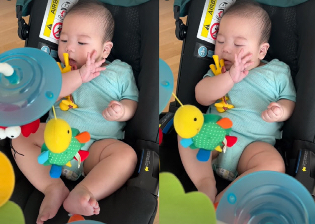 영상 속에는 유모차에 앉아 있는 아들 준범 군의 모습이 담겨있다. 생후 4개월로 폭풍성장 중인 준범 군. 이때 장난감을 물고 옹알거리며 혼자 놀고 있는 모습이 귀여움 가득하다. 아들의 사랑스러운 모습을 놓칠 수 없었던 아빠 제이쓴은 카메라에 아들의 모습을 담는 등 아들 바보 면모를 자랑했다.