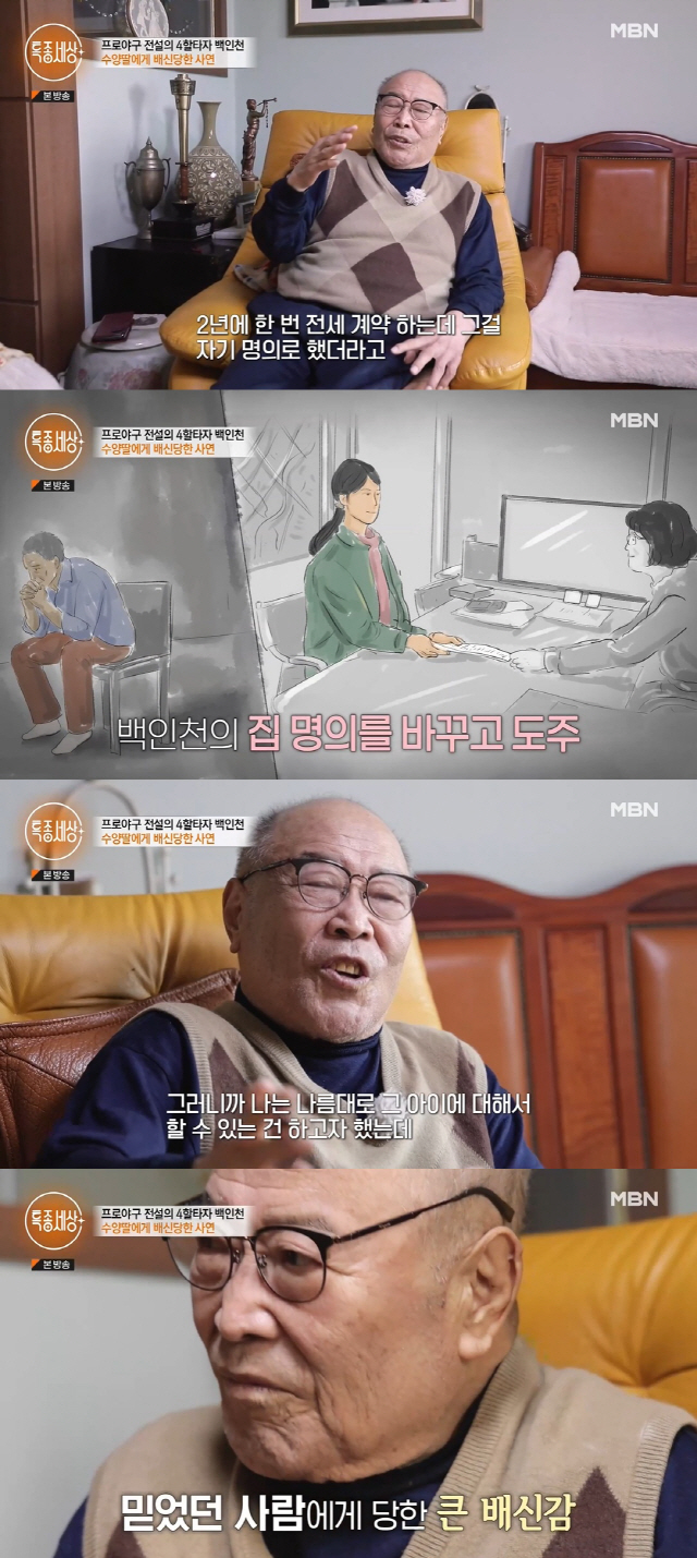 백인천은 은퇴 후 사기를 당하고 힘든 시간을 보냈다고 했다. 백인천은 수양딸이 자신의 명의로 휴대전화를 쓰고 있다면서 "나쁜 짓을 많이 했다. 내가 돈 관리를 모두 맡기곤 했다. 생활비가 있으면 카드로 쓰라고 했더니 제멋대로 막 써버렸다. 2년에 한 번 전세 계약을 하는데 그걸 자기 명의로 했더라"라며 허탈해했다. 수양딸은 지인의 소개로 만났으며 외로운 그를 챙겨 친딸처럼 여겼지만 몰래 법적 공증을 받고 집까지 명의를 바꾸고 도주했다고.