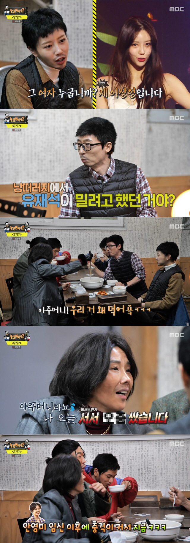 칼국수를 먹던 중 신봉선이 한 입 가져가려 하자 유재석은 "아주머니 우리 거 왜 먹어요"라고 말했다. 이에 신봉선은 "아주머니라뇨. 나 오늘 서서 오줌 쌌습니다"라고 충격 발언을 했다. 모두가 놀란 가운데 하하는 "안영미 임신 이후 충격이 크다"고 밝혀 웃음을 안겼다.