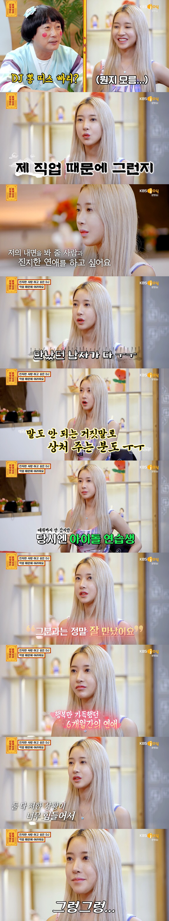 가장 길게 만난 연애를 묻자 "DJ 하기 전에 6개월 정도 만난 것이다. 남자 분이 아이돌 연습생이었는데 그분과는 정말 잘 만났다. 가장 행복했던 6개월이다"라고 전했다. 이어 "하지만 둘다 처한 상황이 힘들어서 헤어지게 됐다. 눈물을 흘리며 이별했다"면서 울컥한 모습을 보였다. 직업 특성상 들쭉 날쭉한 스케줄과 어려운 경제적 형편 때문에 데이트도 잘 못했다고 털어놨다.