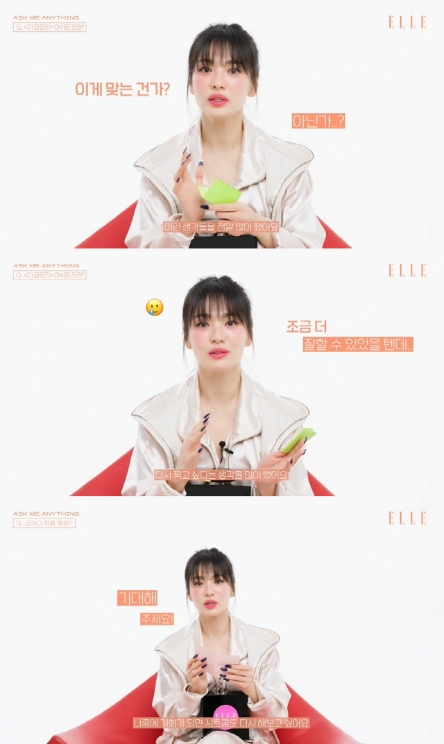 해당 인터뷰에서 송혜교는 팬들의 궁금증을 직접 풀어줬다. 송혜교는 '더 글로리'에서 아쉬웠던 장면에 대해 "첫 장르물이어서 촬영 초반엔 다 어려웠다. 이게 맞는 건가? 아닌가? 이런 생각을 정말 많이 했다"며 "이미 지나갔지만 기회가 된다면 초반에 찍었던 장면들을 다시 찍고 싶다는 생각을 많이 했다. 근데 또 시간이 지나고 방송을 보니 최선을 다했다는 생각이 든다"고 밝혔다.