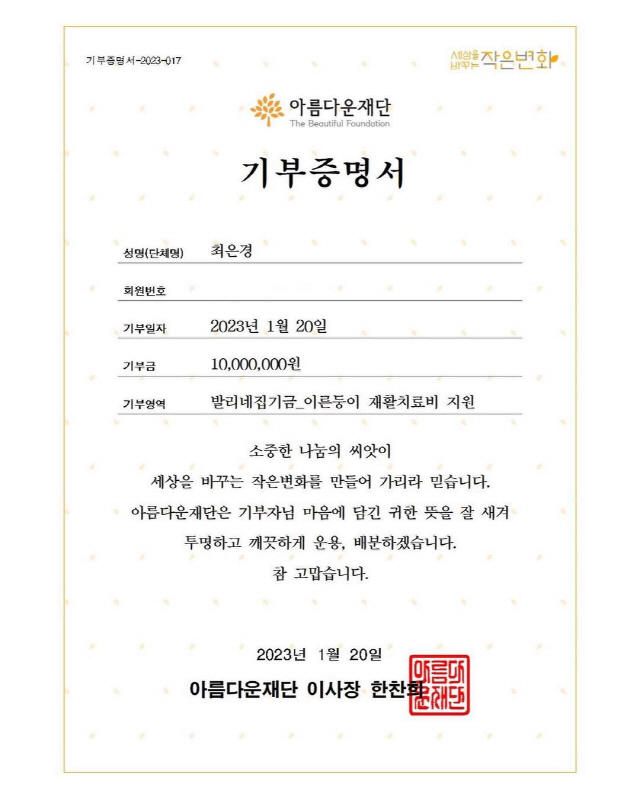 최은경은 이른둥이 재활치료비 지원을 위해 아름다운재단에 천만 원을 기부했다. 최은경은 "발리네집 기금은 세상에 일찍 나왔지만 경제적인 이유로 치료가 힘든 우리 이른둥이를 돕기 위해 아름다운재단에 만든 저희집 가족 기금"이라며 "발리네집 기금은 저희의 매달 정기기부와 중간중간 이런 일시 기부, 거기다가 저희의 뜻에 같이 동참해주신 몇몇 분의 정기기부자 분들의 참여로 운영 되고 있어요. 다시 한 번 감사 드린다"고 덧붙였다. 최은경은 지난해 10월 결혼 23주년을 맞아 천만 원을 기부하기도 했다.