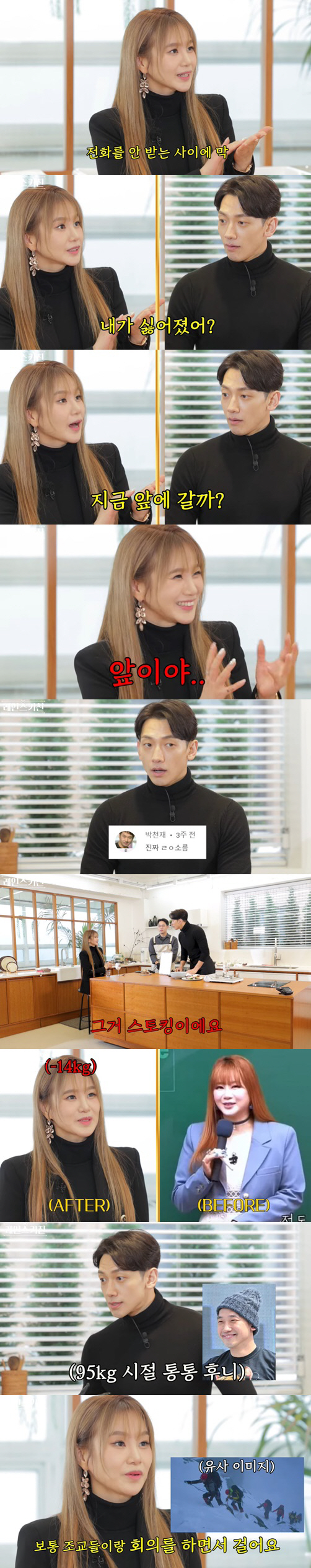 이에 비는 "저도 몸무게가 95kg까지 나간 적 있었다. 이러다가는 정말 내 삶을 다 잃어버릴 수 있겠구나 싶어서 살을 빼기 시작해서 지금까지 유지 중이다"라고 고백했다.