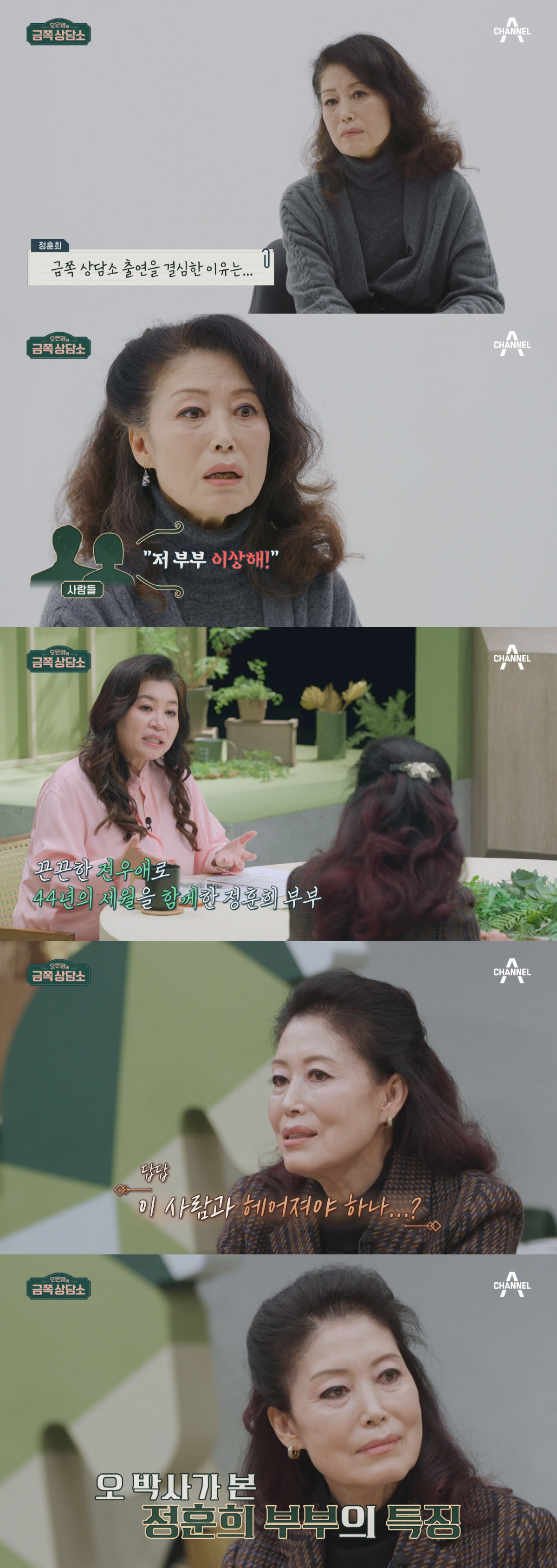 이어 정훈희는 김태화에 대해 노래할 땐 터프하지만 실제론 예민한 사람이라 김치통 하나 씻는 걸로도 잔소리를 한다며, 결국 서로를 일절 터치하지 않게 된 현재의 부부생활에 대해 말을 이어간다. 이를 유심히 듣던 오은영 박사는 정훈희의 '정서적 개방성'이 상당히 높기 때문에 서로를 소유하려 하지 않는 자유로운 결혼생활이 가능했음을 짚어낸다. '분거 생활' 또한 함께 잘 살기 위해 선택한 타협점이라 덧붙이며 '혼전 동거'가 '분거 생활'로 이어지게 된 원인에 대해 낱낱이 파헤친다.