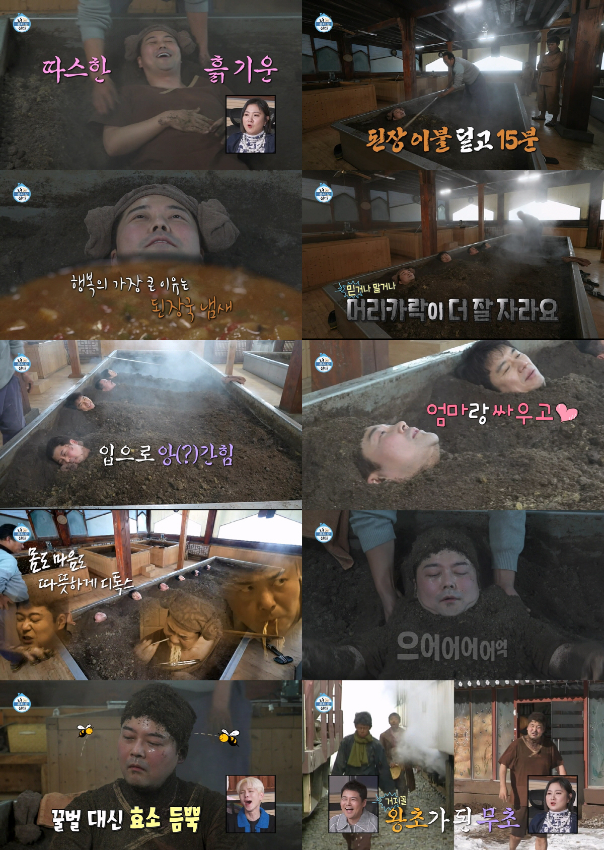 전현무를 시작으로 효소 찜질 동기(?)들이 입장해 온몸을 흙으로 덮었다. 여러 사람이 머리만 빼꼼 내밀고 나란히 누운 모습은 마치 된장찌개 속 콩나물을 보는 듯해 미소를 유발했다. 키는 "다들 머리만 빼고 있으니 되게 귀엽다"며 웃었다.