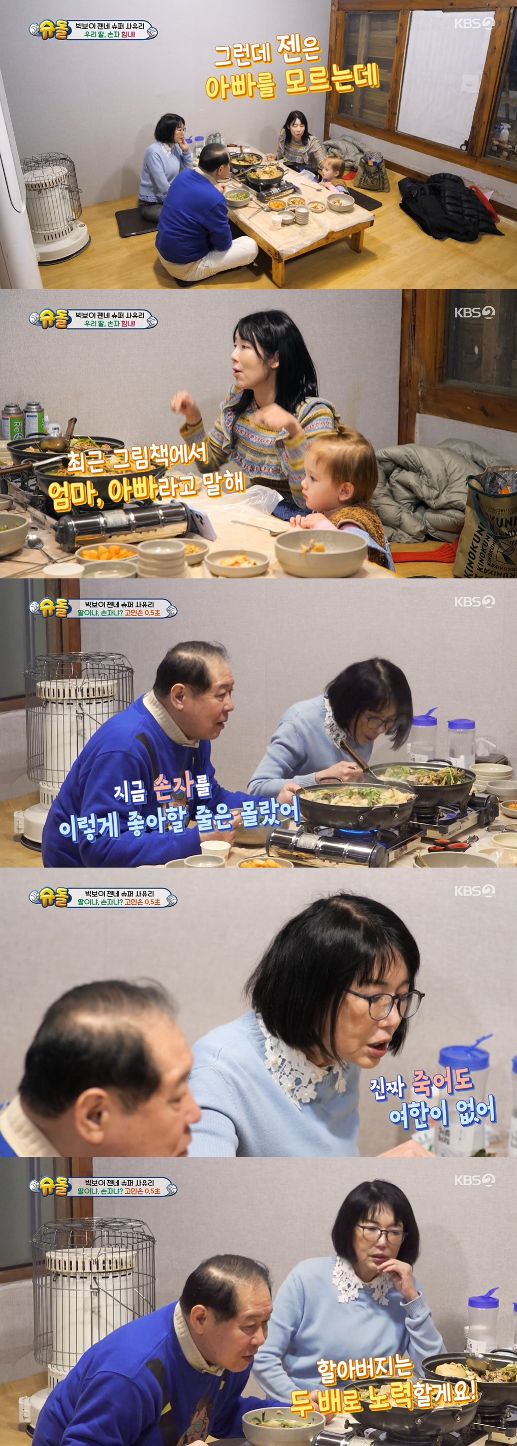 또한 할아버지와 할머니는 '자식 키우기와 손자 돌보기 중 뭐가 더 좋냐'는 질문에 "손자"라고 답했다. 할아버지는 "손자를 이렇게 좋아할 줄 몰랐다. 이 나이에 귀여운 아이가 나오면 기분이 전혀 다르다. 일이 별로 없을 때 보니까"라고 했다. 할머니 또한 "옛날엔 뭐든지 일이 바빠서 아이가 그렇게 귀엽다고 느끼지 못했다. 일로 한 창 바빴고"라면서 "지금은 젠을 보고 있으면 '이렇게 귀여운 거구나' 진짜 죽어도 여한이 없다"고 했다.