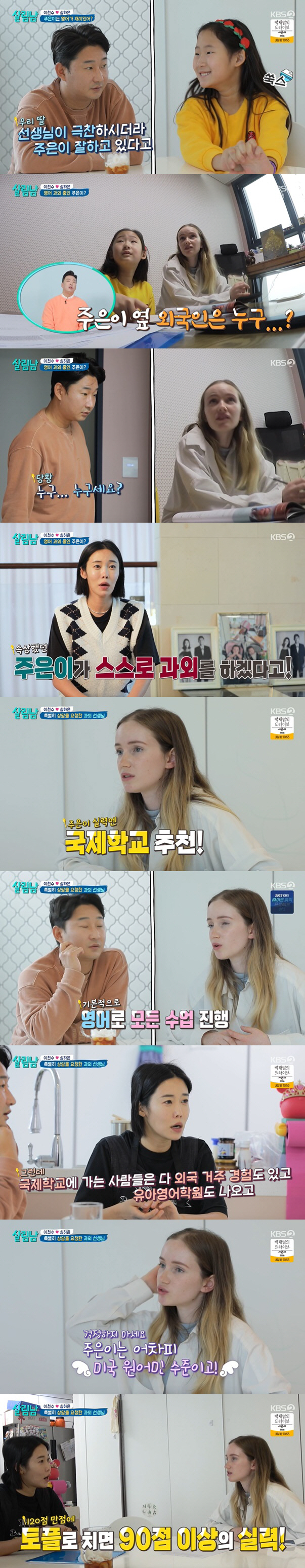 이에 이천수는 "국제학교 들어가려면 어떻게 해야하느냐"고 질문했고, 선생님은 "외국 거주 경험이 없으면 시험을 통한 입학도 가능하다"며 "주은이에게 가장 필요한건 영어에 노출되는 환경이 조성이필요하다"고 알려주었다.