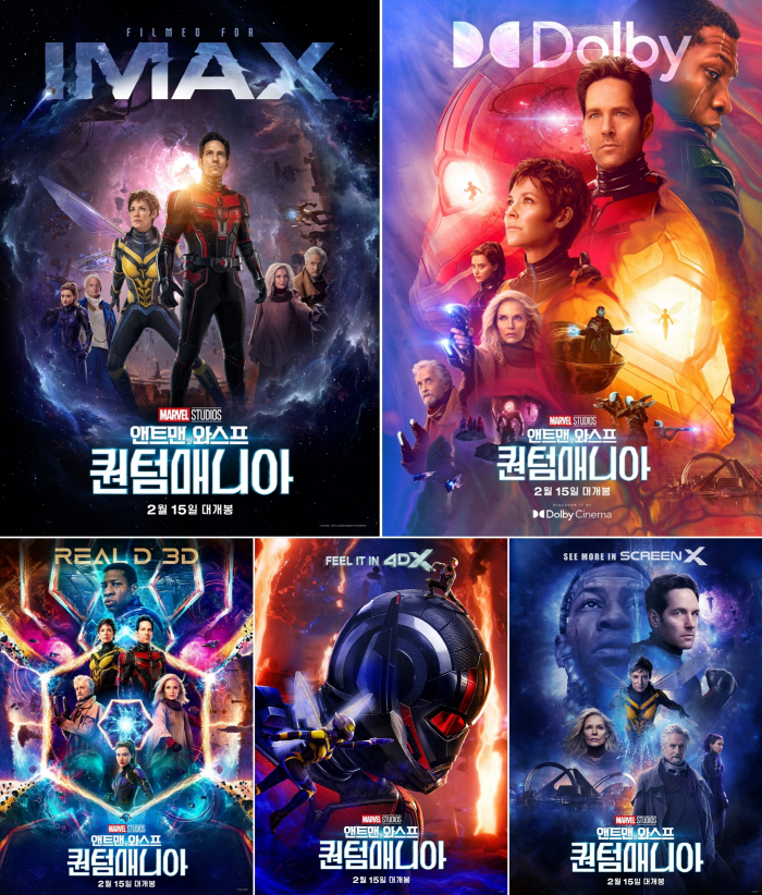 [스포츠조선 조지영 기자] 액션 영화 '앤트맨과 와스프: 퀀텀매니아'(이하 '앤트맨3', 페이튼 리드 감독)가 IMAX부터 돌비 시네마, 3D, 4DX, Super 4D, ScreenX까지 다양한 포맷 개봉을 앞두고 포맷별 포스터 5종을 전격 공개했다.