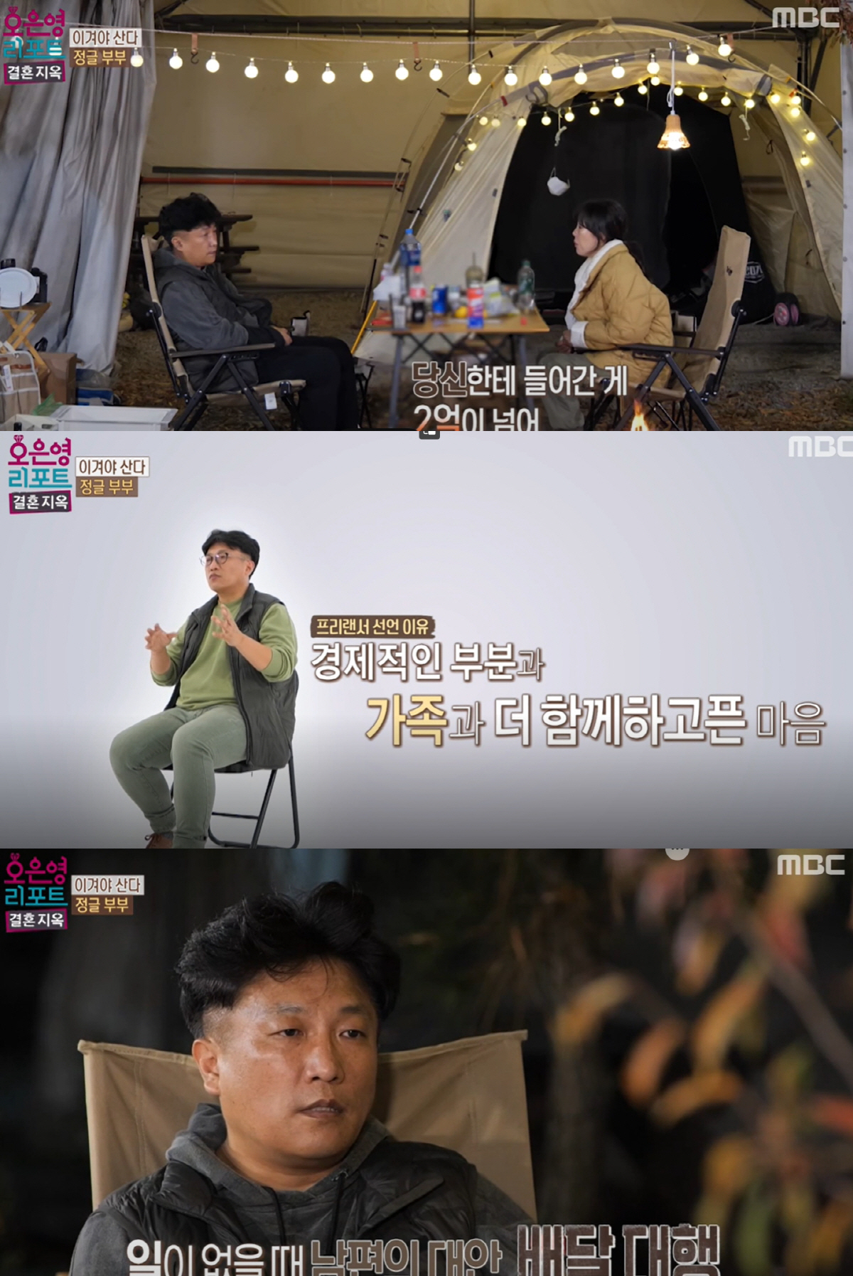 다음 날, 가족들과 함께 떠난 캠핑장에서 남편은 회사를 관두고 프리랜서로 활동하겠다는 마음을 내비쳤다. 현재 회사에서 하는 일이 체력적으로 힘들고, 더 큰 돈을 벌고 싶다는 이유였다. 아내는 남편의 말을 듣자마자 단호하게 반대했다. 사실 남편은 이미 3번의 사업 실패 경험이 있었던 탓. 게다가 남편 사업 자금과 뒷수습에 들어간 비용만 무려 2억이라고 밝혀 모두를 놀라게 했다.
