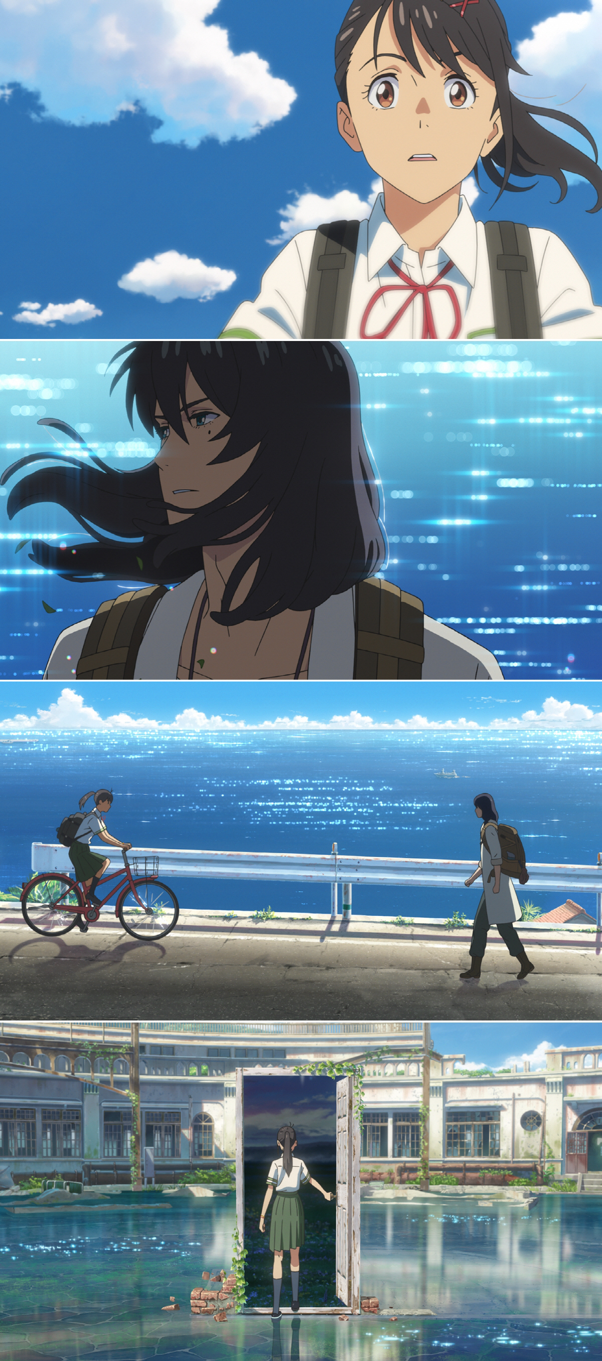 이번에 공개된 보도스틸은 우연히 재난을 부르는 문을 열게 된 스즈메와 스즈메가 살고 있는 마을을 방문한 청년 소타의 운명적인 만남이 포착돼 눈길을 사로잡는다. 소타에게 한눈에 시선을 빼앗긴 스즈메의 모습에서 두 사람이 어떤 관계로 발전할 것인지 호기심을 자극한다.