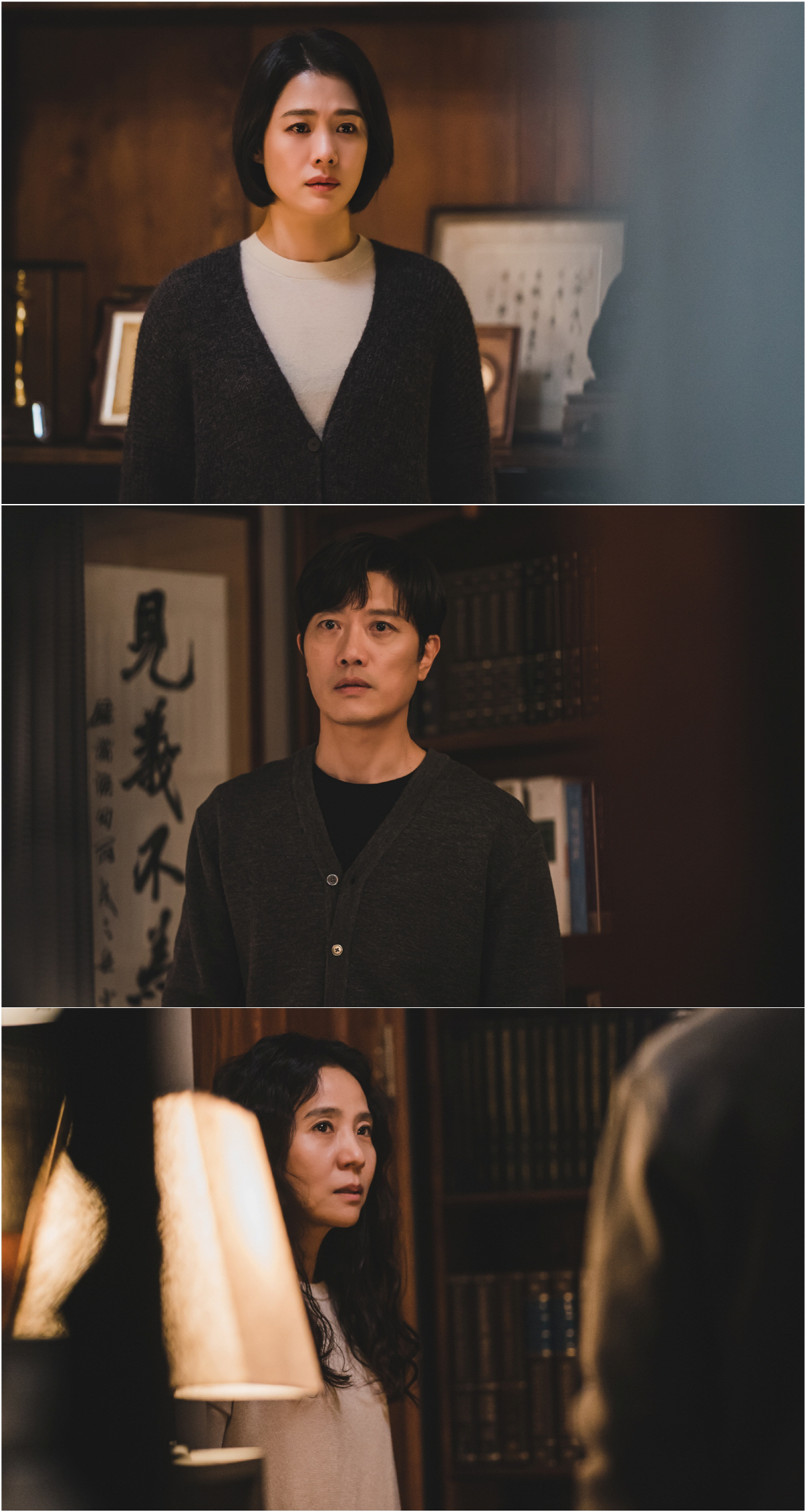 남중도에 대한 연이은 폭로에 김혜주의 감정이 요동치는 가운데, 공개된 사진 속 삼자대면한 이들 사이로 미묘한 긴장감이 흐른다. 김혜주는 분노와 체념이 뒤엉킨 눈빛으로, 남중도는 당황한 기색이 역력한 표정으로 서로를 바라보고 있다. 여기에 서재 문 앞을 서성이며 두 사람을 지켜보는 현여진의 얼굴도 복잡하긴 마찬가지. 처음이자 유일한 가족이 되어준 남중도, 늘 고맙고 애틋한 또 다른 가족 현여진에 대한 김혜주의 믿음이 배신으로 돌아왔다. 과연 김수빈의 폭로들은 사실이었을지, 세 사람 앞에 놓인 판도라의 상자가 호기심을 증폭시킨다.