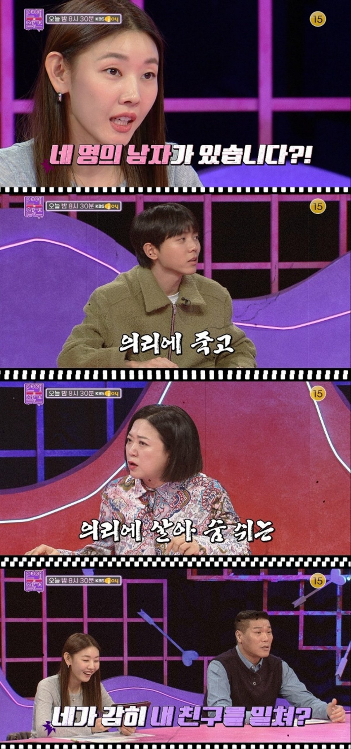 이에 스튜디오에서는 남자친구의 행동 중 이해되지 않는 것에 대해 이야기를 나눈다. 주우재는 친구가 이별했는데 남자친구가 고민녀와 여행을 취소한 것을 꼽으며 "두 가지 일에 어떤 연결 관계가 있는지 이해가 안 간다"라고 말한다. 김숙은 "저런 무리들 많지 않나. 저기서 1명 빠지면 의리 없는 취급받는다"라고 설명한다.