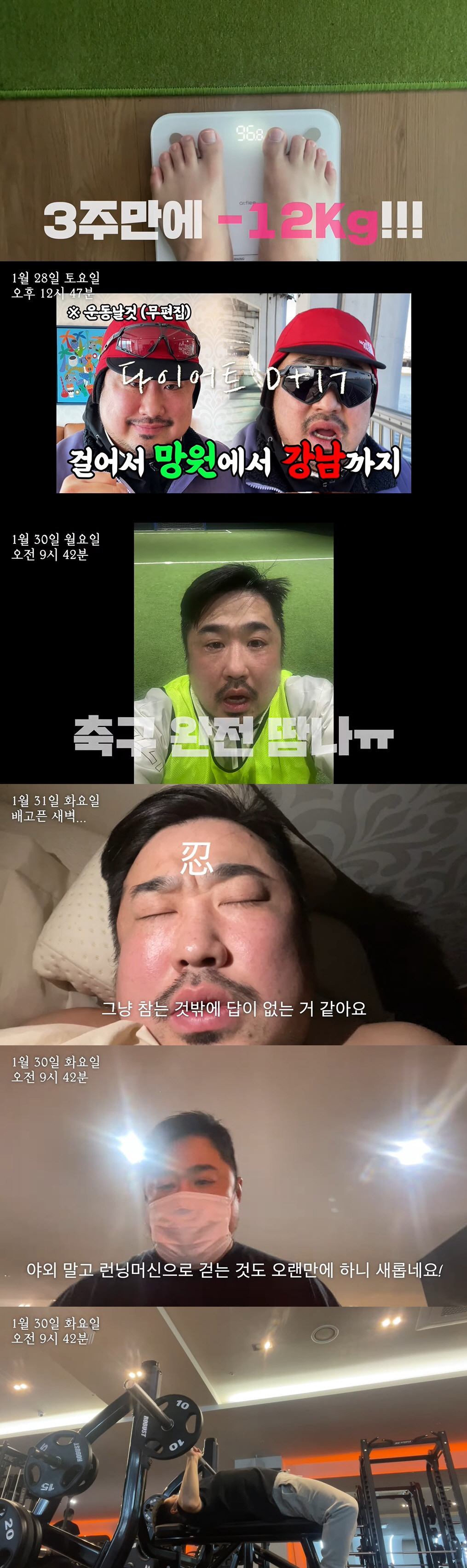 새벽 야식을 참고 공복 유산소까지 한 강재준의 몸무게는 96kg이었다. 3주만에 12kg 감량에 성공했다.