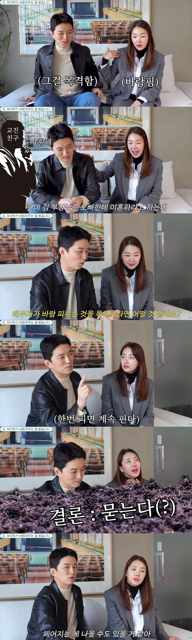 그러면서 "소이현씨와 인교진씨는 배우자가 바람 피우는 것을 목격한다면 어떨 것 같나요?"라고 질문했다. 이에 인교진은 "한번 바람 피면 계속 핀다. 한번이 무서운거다"라고 말했고, 소이현은 "묻어야 한다. 어떻게 조용히 보내주냐"며 분노했다. 이어 소이현은 "볼때마다 생각날 것 같다. 와이프 사랑하는 마음을 갖고 헤어지는게 날 것 같다"고 조언했고, 인교진은 "힘든거 감안할 수 있으면 사는 거다"라고 의견을 전했다.
