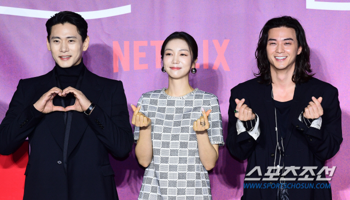 김정권 감독과 배우 유태오, 김옥빈, 김지훈이 8일 용산CGV에서 열린 넷플릭스 시리즈 '연애대전' 제작보고회에서 포즈를 취하고 있다. '연애대전'은 남자에게 병적으로 지기 싫어하는 여자와 여자를 병적으로 의심하는 남자가 전쟁 같은 사랑을 겪으며 치유받는 로맨틱 코미디다. 용산=최문영 기자 deer@sportschosun.com/2023.02.08/