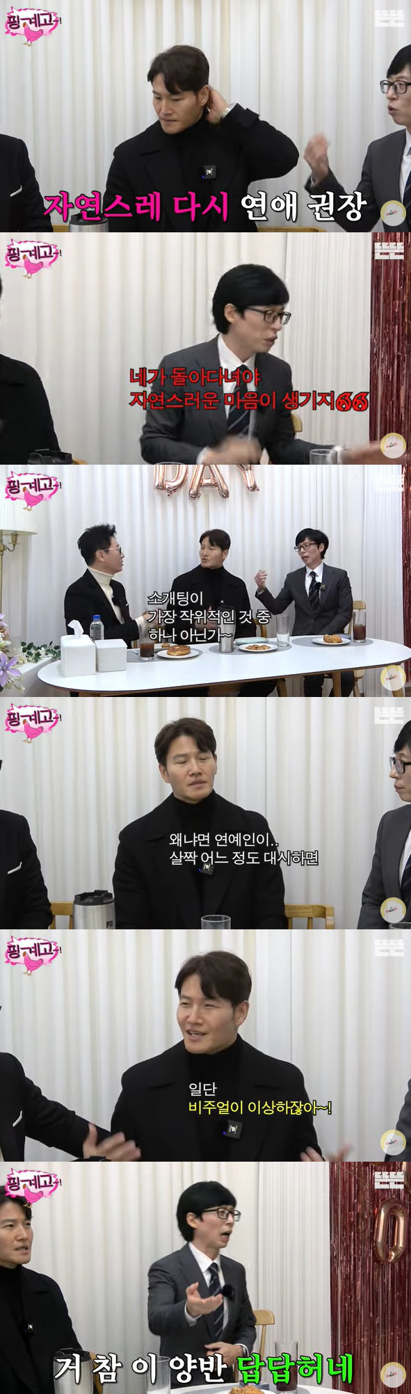 그러나 김종국은 자연스러운 만남을 추구하는 스타일. 김종국은 "작위적인 걸 싫어한다. 소개팅이 가장 작위적이지 않나 싶다"고 말했고 이는 형들을 답답하게 했다. 유재석은 "네가 돌아 다녀야 자연스러운 마음이 생기지. 네가 다니는 동선엔 만날 분이 없다"고 밝혔다. 지석진 역시 "동호회를 나가라", "먼저 대시를 해라"라고 적극적으로 나서라고 제안했다.