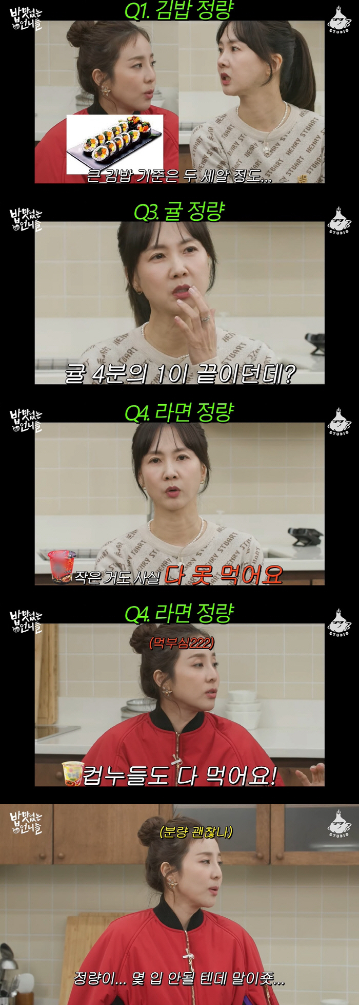 이날 박소현과 산다라박은 "소식좌의 정량을 궁금해하시더라. 직접 요리를 해라"는 제작진의 말에 당황했다. 산다라박은 정량을 묻는 질문에 "큰 김밥 기준은 두 세알 정도, 흰자만 먹는다. 귤은 잘 안 먹는다. 주스로 마신다"고 했고, 박소현은 "노른자만 먹는다. 귤은 4분의 1이 끝이다. 작은 사발면도 다 못 먹는다"고 해 놀라움을 자아냈다. 이에 산다라박은 "짜장범벅, 컵 누들도 다 먹는다"면서 먹부심으로 웃음을 안겼다.