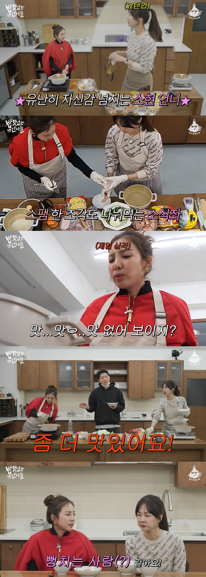 이후 박소현은 "나는 요리 많이 했다"면서 유난히 요부심을 뽐내며 요리를 시작했지만, "다라 누나 쪽에 좀 더 맛있다"는 제작진의 평가에 시무룩해졌다. 또한 박소현 표 부대찌개를 맛 본 산다라박은 "처음으로 소현 언니 뻥치는 사람 같다"고 해 폭소를 터트렸다. 이 과정에서 소식좌는 스팸 한 조각도 나눠먹고, 박소현은 총 11입, 산다라박은 총 15입을 먹으며 먹방을 마무리했다.