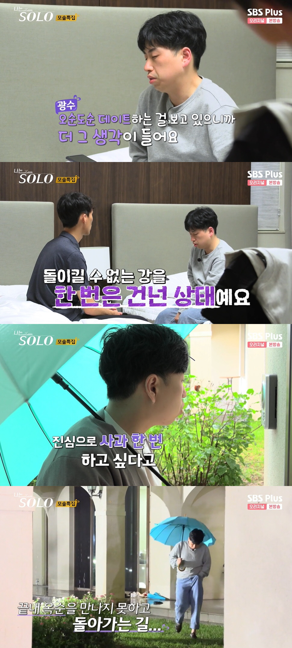 광수는 "미안하다는 말을 해도 그것조차 옥순 님에게 협박으로 느껴질 것 같다. 처음으로 잘 될 것 같은 상대와 데이트를 했는데 이런 결과가 나왔다. 소개팅보다 잘 될 가능성이 높은 상황이었다"면서 "옥순 님이 빨리 행복해지면 좋겠다. 내 감정은 이제 상관없다. 옥순 님이 행복하면 그거면 된다. 나도 집어삼키고 옥순 님도 집어삼켰다"고 털어놨다.