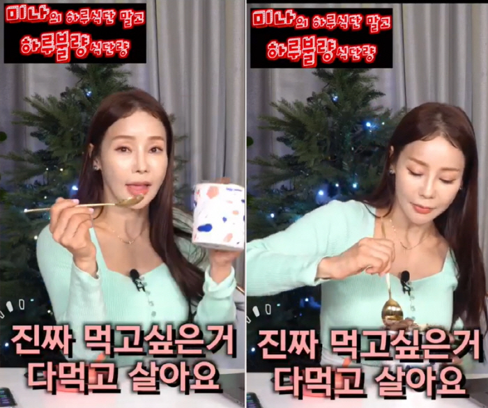 미나는 "밥 먹고도 쿼터 사이즈 정도 아이스크림 양은 먹으려고 열심히 운동 하는 거다. 먹고 당뇨 걸리지 않으려 운동하는 거지. 남편 때문에 피곤하게 살지 않고 먹고 싶은거 다 먹고 산다"며 "아예 다 통째로 먹어볼게요"라며 밥숟가락으로 끝없이 퍼먹었다. 그러다 "아까워. 나머지는 맛없게 먹어야겠다"며 절반 이상 먹은 아이스크림 뚜껑을 정리하며 아쉬워하는 모습.