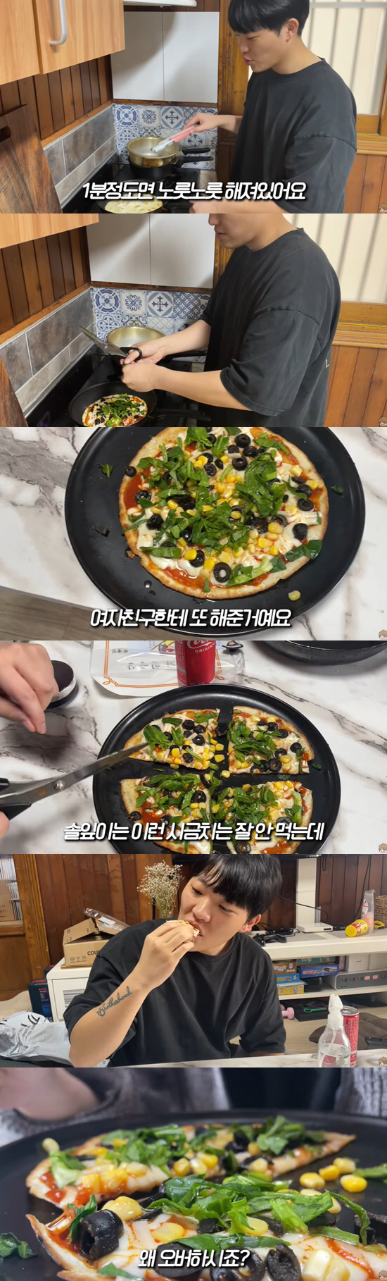 재료는 버터, 또띠아, 피자치즈, 토마토 소스, 스위트콘, 올리브, 시금치가 필요했다. 최고기는 먼저 녹인 버터에 또띠아를 구워준 뒤 토마토 소스를 발라주었다. 그 위에 치츠와 올리브, 스위트 콘, 시금치를 올려주어 피자를 완성시켰다.