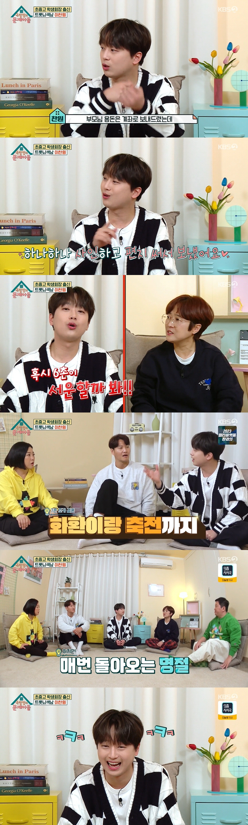 이를 들은 정형돈은 "6촌은 서운하겠다"고 말했고, 이찬원은 "그래서 6촌이 서운할까 봐 6촌 형제의 자녀인 7촌 제종조카가 결혼한다고 해서 화환과 축전을 보냈다. 원래는 축가 부르러 가려고 했는데 시간이 안 됐다"며 남다른 가족애를 자랑했다.