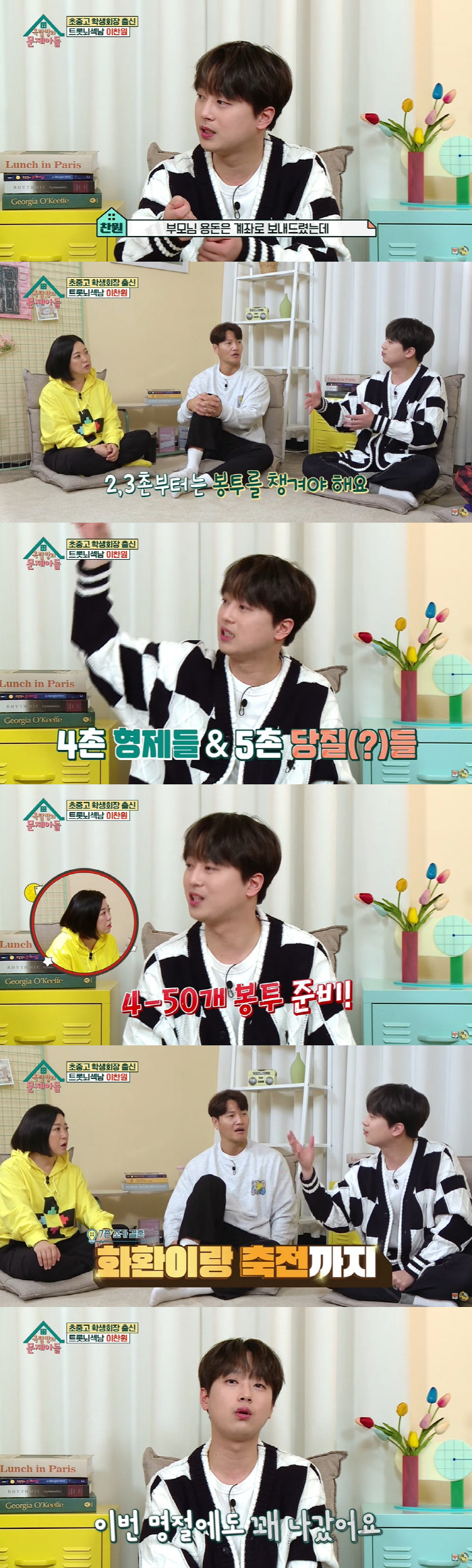 특히 이찬원은 "6촌이 서운할까봐 6촌 형제의 자녀 7촌인 제종 조카가 결혼한다고 해서 화환이랑 축전 영상도 다 보내줬다"라며 남다른 가족애를 자랑했다.