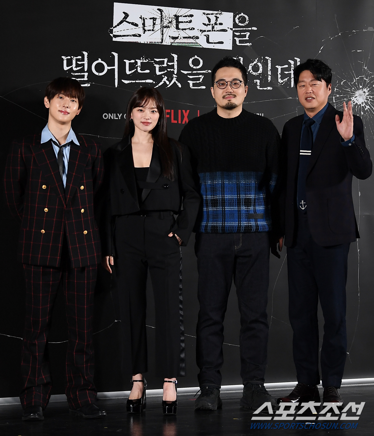 넷플릭스 영화 '스마트폰을 떨어뜨렸을 뿐인데' 제작발표회가 15일 서울 광진구 자양동 롯데시네마 건대입구에서 열렸다. 임시완, 천우희, 김태준 감독, 김희원이 포토타임을 갖고 있다. 자양동=박재만 기자 pjm@sportschosun.com/2023.02.15/