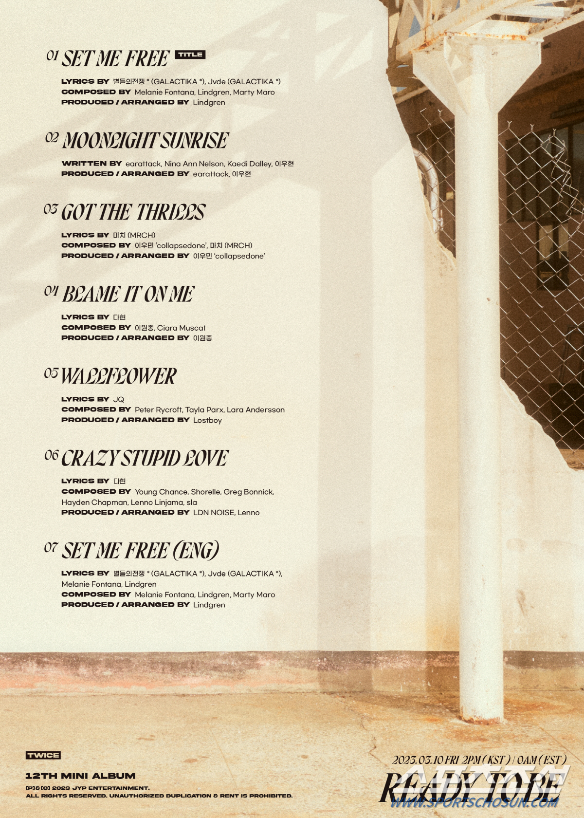 트랙리스트에 따르면 트와이스 미니 12집에는 미국 빌보드 메인 차트 '핫 100' 진입에 빛나는 선공개 영어 싱글 'MOONLIGHT SUNRISE'(문라이트 선라이즈)를 포함해 'GOT THE THRILLS'(갓 더 쓰릴스), 'BLAME IT ON ME'(블레임 잇 온 미), 'WALLFLOWER'(월플라워), 'CRAZY STUPID LOVE'(크레이지 스투피드 러브), 타이틀곡 'SET ME FREE' 그리고 타이틀곡의 영어 버전까지 총 7트랙이 수록된다.