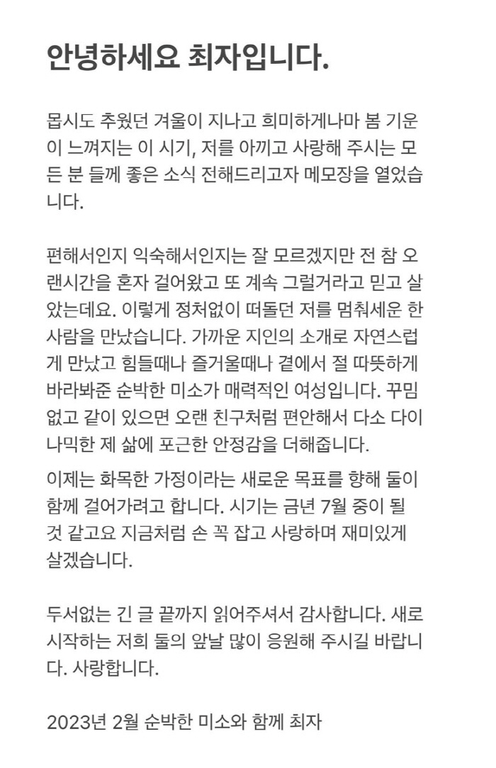 두서없는 긴 글 끝까지 읽어주셔서 감사합니다. 새로시작하는 저희 둘의 앞날 많이 응원해 주시길 바랍니다. 사랑합니다.