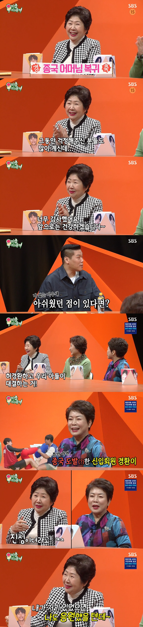 매주 방송을 챙겨봤다는 김종국 어머니는 "출연 안했던 동안 아쉬웠던 점이 있느냐"는 질문에 "허경환 씨하고 우리 아들이 대결하는 편을 보면서 '우리 그 큰 아들이 지면 어떡하나' 싶었다. 허경환 씨가 진심으로 도발하더라. 거기다 허경환 씨 어머니가 스튜디오에서 박수를 치시더라. 나도 스튜디오에 있었으면 우리 아들 응원했을텐데 싶었다"고 솔직하게 답해 웃음을 자아냈다.