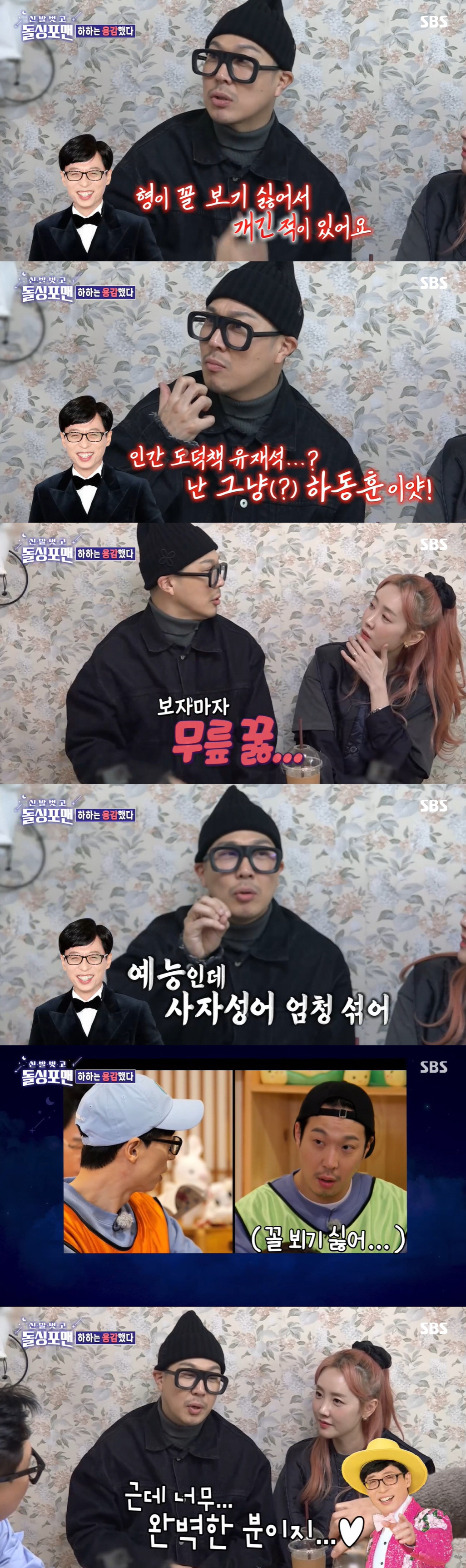 그러면서 하하는 "요즘 꼴보기 싫을 때 공부를 한다. 예능인데 사자성어를 엄청 섞어서 이야기를 한다. 퀴즈 내면서 자기가 괄시를 한다"면서 "'이걸 못 맞혀?' 그럴 때 좀 꼴보기 싫다"고 말했다. 그러나 바로 하하는 "그런데 너무 완벽한 분"이라고 말해 폭소를 안겼다.