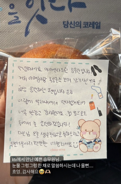 이다은은 이날 생일을 맞아 남편 윤남기와 여행하던 중 KTX에서 자신들을 알아보는 팬을 만난 것으로 보인다. 이 팬은 이다은, 윤남기에게 간식과 함께 직접 쓴 짧은 손 편지까지 건넸고, 이에 감동한 이다은이 인증샷을 남긴 것. 이다은은 "KTX에서 만난 예쁜 승무원님. 눈물 그렁그렁한 채로 말씀하시는데 나 울뻔.. 흐엉 감사해요"라며 고마움을 표현했다.