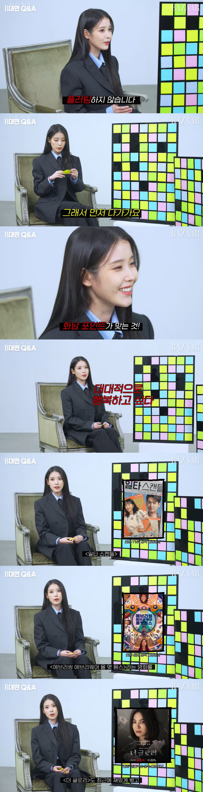 아이유는 최근 재밌게 본 영화나 드라마를 추천해달라는 말에 "많이 추천해도 되냐"며 웃었다. 그러면서 "본방사수 기다리며 보고 있는 드라마는 '일타 스캔들'이다. '이렇게 기분 좋아지게 하는 드라마 너무 좋아' 이러면서 잠든 기억이 있다. '일타 스캔들' 되게 좋아한다"고 밝혔다. 또 "요즘 나한테 의미가 큰 영화인데 '에브리씽 에브리웨어 올 앳 원스'라는 영화를 너무 재밌게 봤다. 그 영화 좋아하는 사람과 대화를 하면 정말 오랫동안 쉼 없이 얘기할 거 같다"며 "그 영화를 정말 좋아하는 분이라면 너무 쉽게 대화가 될 거 같다. 첫 만남에서부터 내가 막 적극적으로 궁금해할 거 같다. 난 진짜 매일 볼 수 있다. 사실 그 영화 감독님한테 편지도 섰다. 보내지는 않았지만"이라며 영화의 '찐 팬'임을 강조했다. 이어 "한 가지만 더 추천하자면 '더 글로리'도 최근에 재밌게 봤다. 시즌2 기다리고 있다"고 덧붙였다.