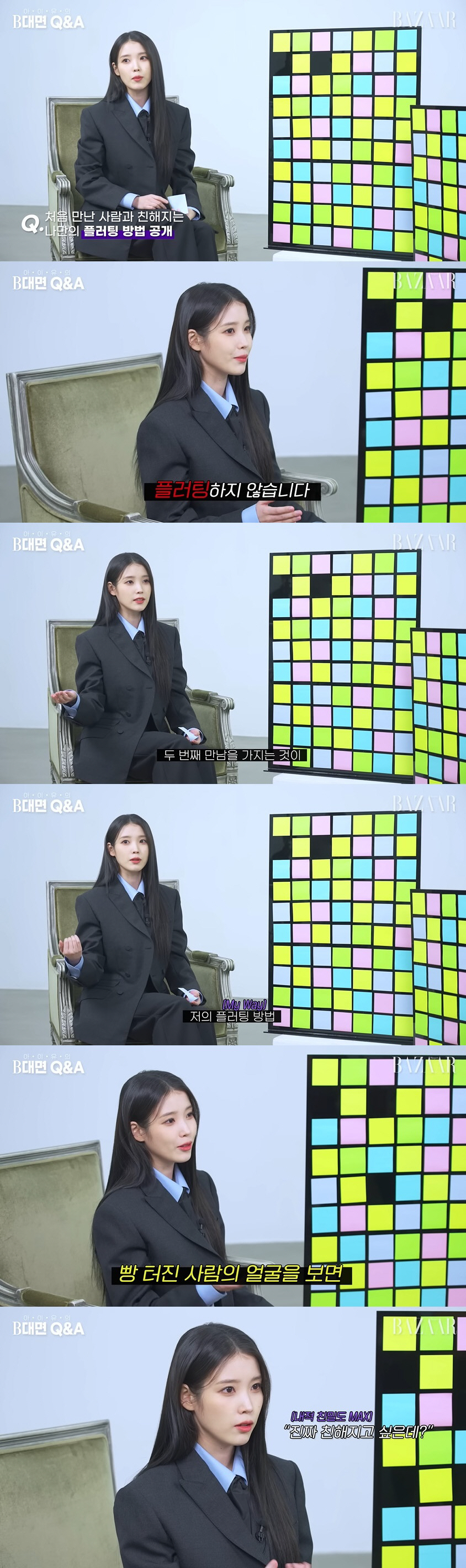 아이유는 "처음 만난 사람과 친해지는 나만의 플러팅 방법"에 대해 "처음 만나 자리에서 플러팅 하지 않는다. 적어도 두세 번을 보고 친해지고 싶은 생각이 첫 만남에서 들면 두 번째 만남을 가지는 것이 저의 플러팅 방법"이라 밝혔다.