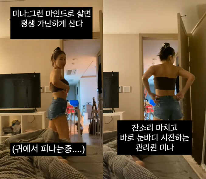 이후 미나는 눈바디 체크를 하며 군살 하나 없는 완벽한 몸매를 자랑해 감탄을 자아냈다.
