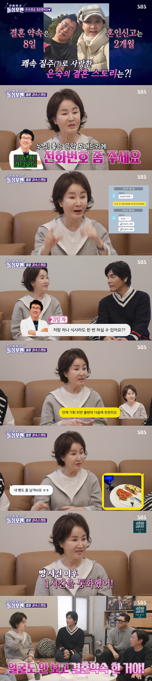 '빵 사건' 이후로 1시간 통화를 시작했다는 선우은숙은 "통화 시간이 점점 늘었다. 젊은애들 연애한 것처럼 했다. 그 사람에게 점점 빠져들었다"며 "남편에게 신앙생활 같이할 수 있느냐고 물었다. 그런데 남편이 목사님 아들이라고 하더라. 또 술도 절제할 수 있냐고 물어봤다니 가능하다고 하더라. 그래서 나하고 결혼하자고 고백했다. 8일째에 전화로 프러포즈한거다. 남편도 바로 승낙했다"고 초고속 프러포즈 스토리를 전해 모두를 깜짝 놀라게 했다. 이를 들은 '돌싱포맨' 멤버들과 게스트들은 "8일만에 결혼이라니 이건 사고다. 할리우드 배우같다"라며 감탄했다.