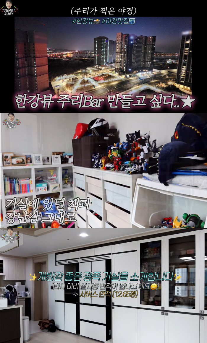 정주리는 "여기 한강뷰 야경이 너무 예쁘다. 이사 와서 남편과 입주 축하 파티를 했다. 베란다에 바를 만들고 싶었는데 짐이 쌓일 것 같은 느낌이다. 요즘 남편과 함께 업이 된 상태다. 요즘 나에게 모든 행복이 온 것 같은, 많은 분들이 제 행복을 빌어주시는 것 같아서 많이 벌고 대출금 갚고 나눌께요"라고 인사했다.