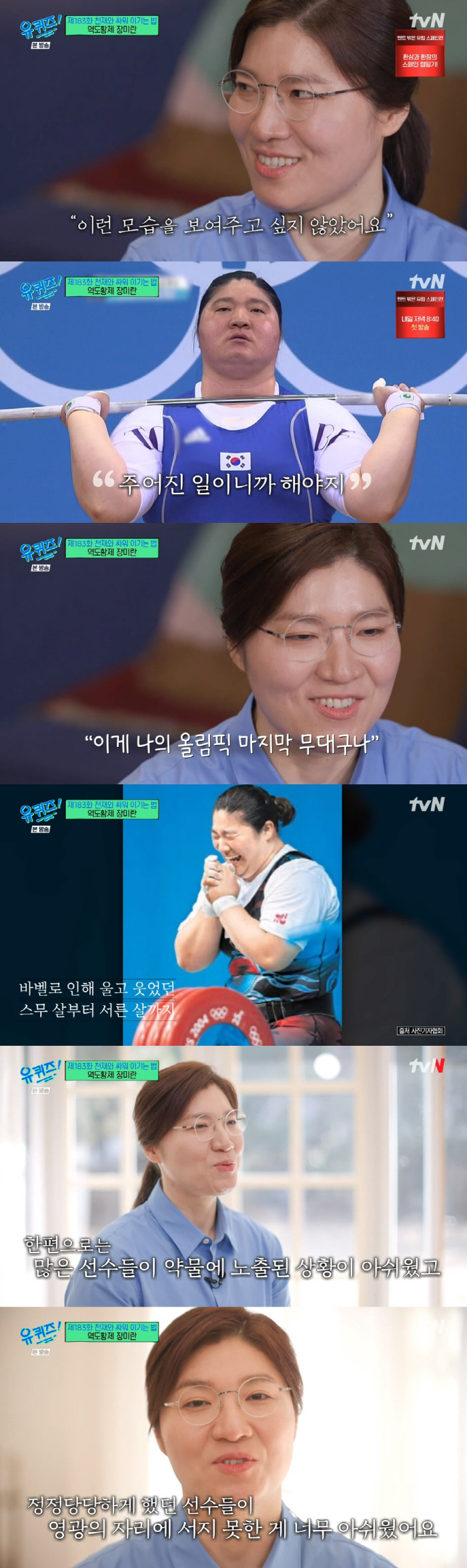 장미란은 "그래도 '3등은 하겠지'라고 생각을 했는데, 마지막 시기를 성공하면 동메달 못하면 4등이었다"면서 "마지막 시기를 할 줄 알았는데 못했다. 그냥 떨어뜨리는데 웃음이 나더라"고 했다.