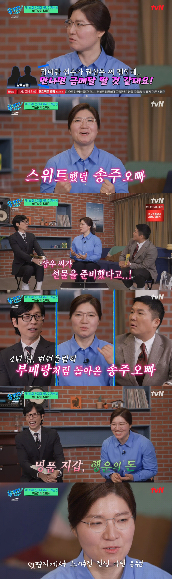 2004년 아테네 올림픽에서 은메달을 딴 장미란. 당시 시상대 위에서 손을 흔든 장미란. 그는 "손에 피물집이 잡혔는데 시합하다가 터졌다. 피가 범벅이 됐다. 언니들이 사진을 찍어줘서 손을 흔들었다. 큰 상처는 아니었는데 한국에서 난리가 났다"면서 "저보다 안타까워해주시고 더 많이 응원해주셨던 거 같다"고 했다. 이어 하루 연습량에 대해 장미란은 "아주 많이 했을 때는 50000kg? 보통 했을 때는 2-30000kg 했던 거 같다"고 말해 놀라움을 자아냈다.