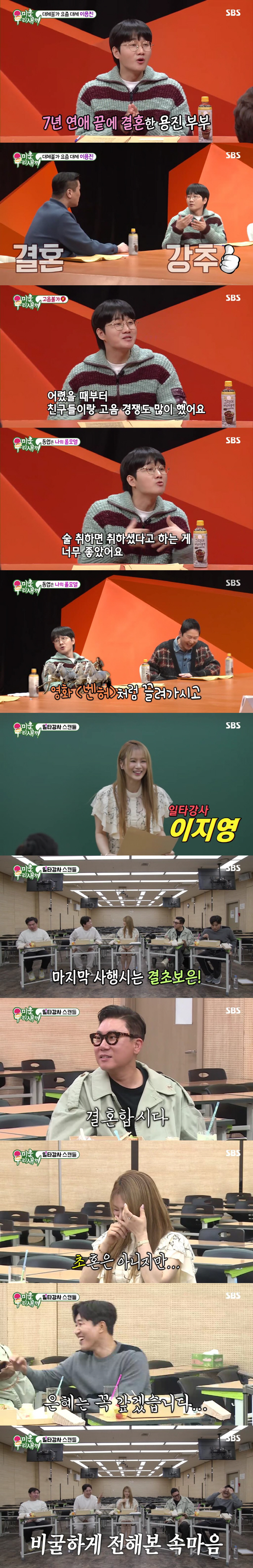 이에 서장훈이 "지금 인기가 좋은데 너무 빨리 결혼한 것 같지 않냐?"고 묻자 이용진은 "그땐 인기가 너무 없어 결혼이라도 했어야 했다"고 고백했다. '5년 전 지금의 인기였어도 결혼했을 것 같냐'고 집요하게 묻자 이용진은 바로 "결혼했을 것이다. 이런 질문은 뜸들일 수록 손해본다"며 "결혼제도 자체를 워낙 좋아한다"고 너스레를 떨어 웃음을 안겼다.